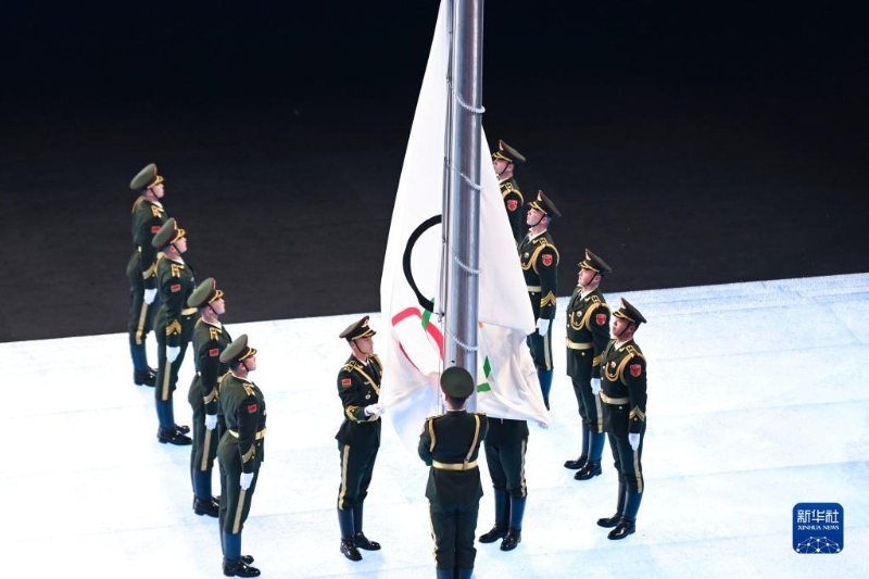 這是奧林匹克會旗(左)降下。