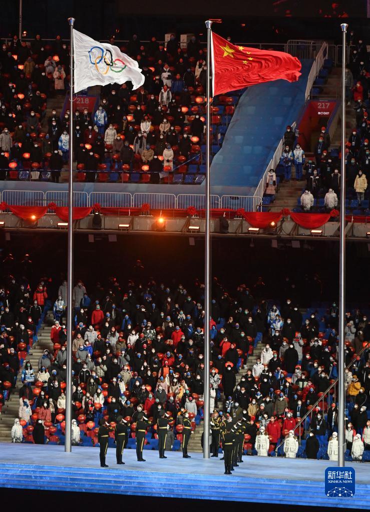 這是奧林匹克會旗與中華人民共和國國旗在閉幕式上飄揚。