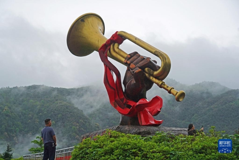游客在江西省井岡山市參觀“勝利的號(hào)角”雕塑(2021年4月27日攝)。新華社記者 萬(wàn)象 攝