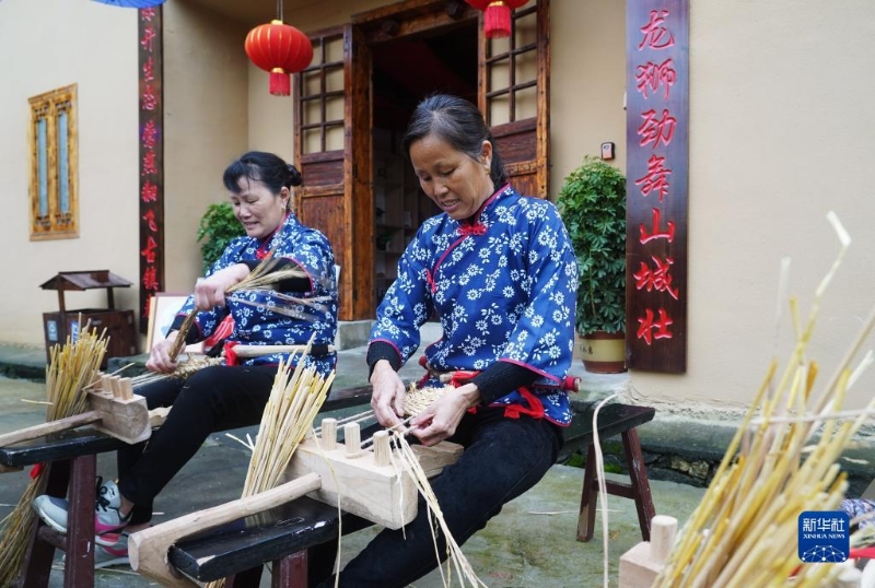 在江西省井岡山市古田村,村民在編草鞋紀(jì)念品(2021年4月28日攝)。新華社記者 萬(wàn)象 攝