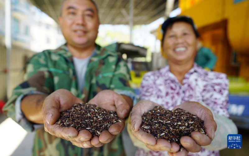 在位于江西省井岡山市龍市鎮(zhèn)的井岡山市高山紅米種植專業(yè)合作社,文龍才(左)和社員展示脫殼的井岡紅米(2019年9月23日攝)。新華社記者 彭昭之 攝