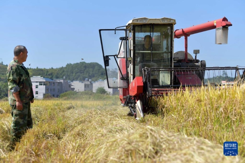 在江西省井岡山市龍市鎮(zhèn),井岡山市高山紅米種植專業(yè)合作社社長(zhǎng)文龍才(左)和社員在稻田里收割成熟的紅米稻谷(2019年9月23日攝)。新華社記者 彭昭之 攝