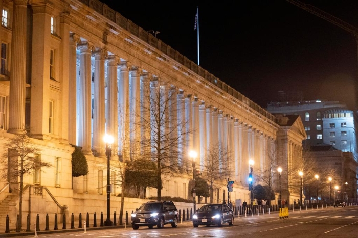 這是2月28日在美國首都華盛頓拍攝的美國財政部大樓。(新華社記者劉杰攝)