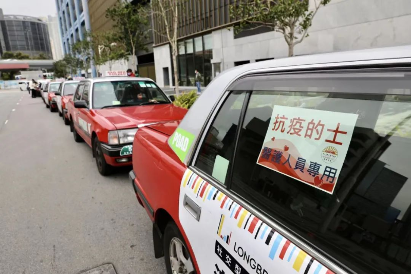 由香港的士總會青年聯(lián)合會和香港菁英會組成的香港青年抗疫愛心車隊(duì),協(xié)助接送醫(yī)護(hù)人員往返醫(yī)院及運(yùn)送抗疫物資,每部車身都貼有「抗疫的士醫(yī)護(hù)人員專用」標(biāo)識。