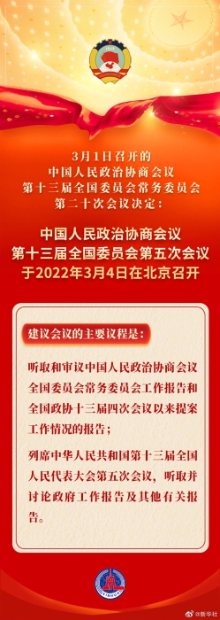 3月1日召開的中國人民政治協(xié)商會(huì)議第十三屆全國委員會(huì)常務(wù)委員會(huì)第二十次會(huì)議決定:中國人民政治協(xié)商會(huì)議第十三屆全國委員會(huì)第五次會(huì)議于2022年3月4日在北京召開。建議會(huì)議的主要議程是:聽取和審議中國人民政治協(xié)商會(huì)議全國委員會(huì)常務(wù)委員會(huì)工作報(bào)告和全國政協(xié)十三屆四次會(huì)議以來提案工作情況的報(bào)告;列席中華人民共和國第十三屆全國人民代表大會(huì)第五次會(huì)議,聽取并討論政府工作報(bào)告及其他有關(guān)報(bào)告。