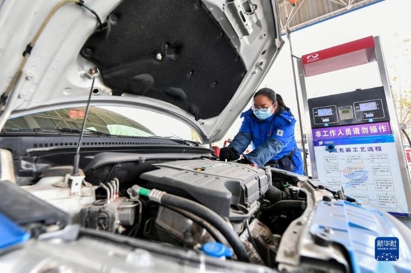 山西省晉城市澤北加氣站工作人員在為汽車加煤層氣(2020年12月9日攝)。新華社記者 曹陽 攝