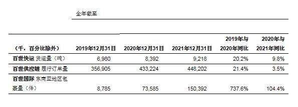 財報數(shù)據(jù)顯示,2021年百世集團營收(不含已轉(zhuǎn)讓的國內(nèi)快遞業(yè)務(wù))為人民幣114.26億元,同比增長8.5%;百世快運全年貨運量同比增長9.8%;百世供應(yīng)鏈全年云倉訂單總數(shù)同比增長3.5%;百世國際在東南亞地區(qū)的全年包裹總量同比增長104.4%。