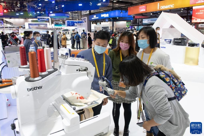 這是2021年11月8日拍攝的進(jìn)博會技術(shù)裝備展區(qū)的日本Brother集團(tuán)展臺。(新華社記者孟濤攝)