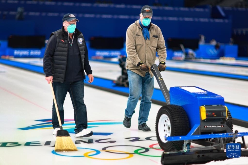 圖為加拿大的制冰師漢斯·烏斯里奇(左)在“冰立方”指導(dǎo)團隊成員使用制冰設(shè)備(2022年1月28日攝)。新華社記者 劉續(xù) 攝