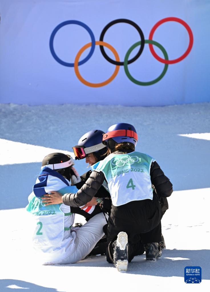 圖為在北京2022年冬奧會自由式滑雪女子大跳臺決賽后,中國選手谷愛凌(右)和瑞士選手瑪?shù)贍柕隆じ窭啄?中)安慰法國選手苔絲·勒德(2022年2月8日攝)。新華社記者 武巍 攝