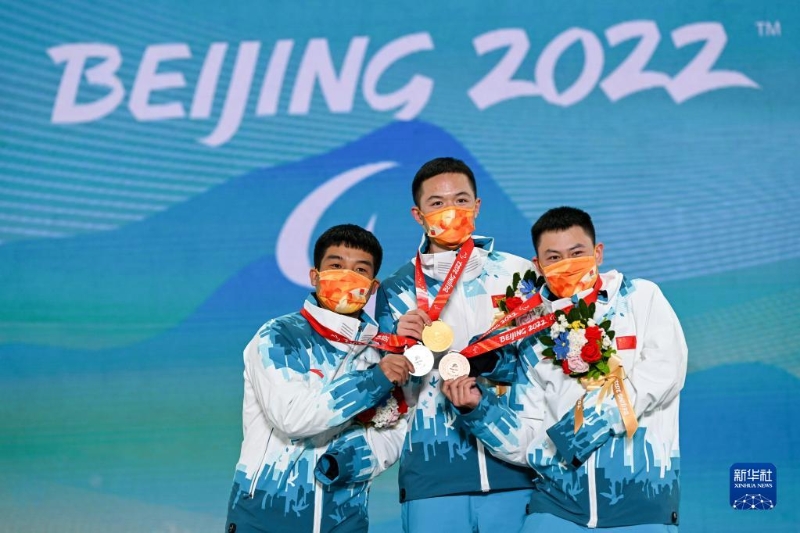 3月7日,中國選手冠軍紀立家(中)、亞軍王鵬耀(左)和季軍朱永鋼在北京2022年冬殘奧會殘奧單板滑雪男子障礙追逐(UL級)比賽獎牌頒發(fā)儀式上。新華社記者 胡超 攝