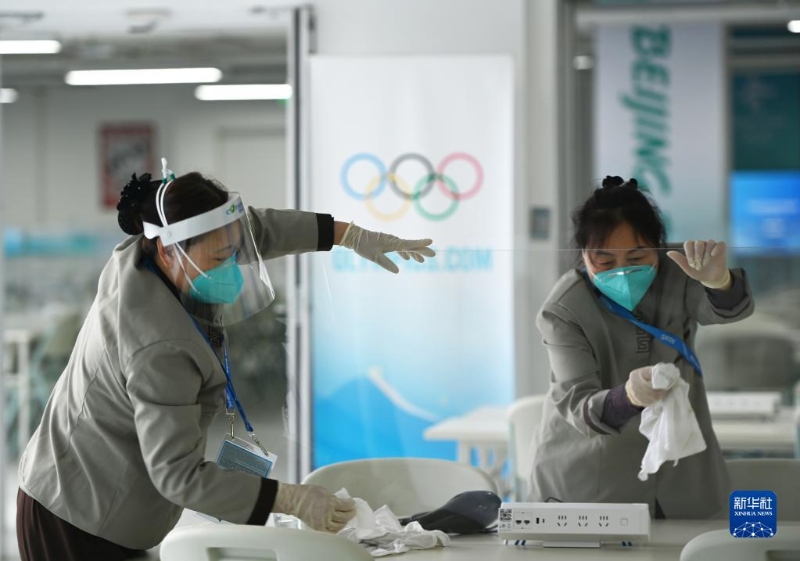 圖為工作人員在北京國家速滑館“冰絲帶”的媒體工作區(qū)域消毒(2022年1月28日攝)。新華社記者 武巍 攝