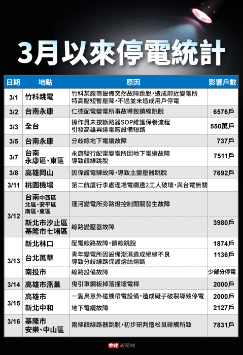 3月以來已有12次停電紀(jì)錄。 (圖/中時(shí)新聞網(wǎng)陳友齡制表)