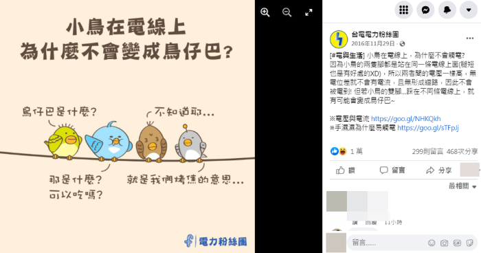 根據(jù)臺電6年前的貼文表示,“小鳥在電線上,為什么不會觸電?”因為小鳥的腿比較短,兩只腳都是站在同一條電線上,兩腳踩的電壓一樣高,無電位差就不會有電流,也無法形成回路,因此不會被電到,若小鳥的雙腳分別踩在不同的電線上,就有可能變成“焦阿巴”。