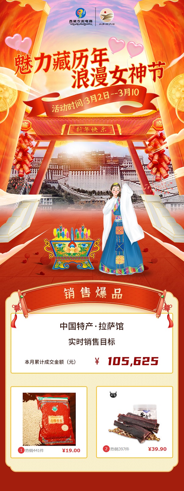 三八國際婦女節(jié),正好是藏歷新年正月初六,雙節(jié)同慶,我們中國特產(chǎn)·拉薩館跟隨者京東平臺,舉行了“魅力藏歷年 浪漫女神節(jié)”的活動,拉薩館緊跟鄉(xiāng)村振興的步伐,精選出7個地市的農(nóng)特產(chǎn)品,諸如西藏牛肉干,西藏奶制品,高原天然水,蜂蜜野生菌等,通過電商平臺帶動西藏自治區(qū)農(nóng)特產(chǎn)品的銷售,一周時間,實現(xiàn)了10萬元的銷售,對助力鞏固脫貧攻堅盡出自己的一份力量。