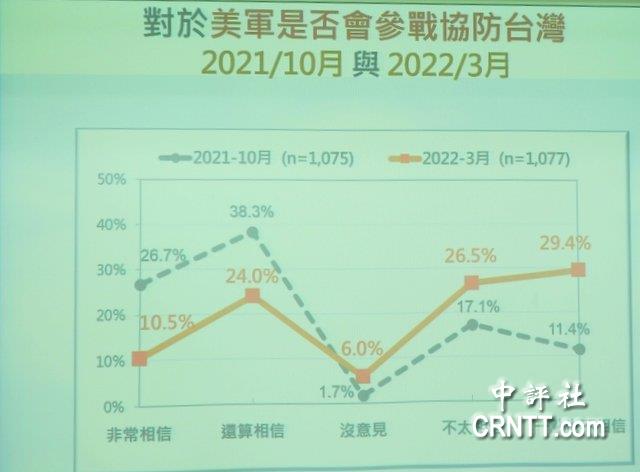 臺(tái)灣“民意基金會(huì)”今天公布3月份最新民調(diào)結(jié)果,對(duì)于美國(guó)是否派兵協(xié)防臺(tái)灣?臺(tái)灣“民意基金會(huì)”董事長(zhǎng)游盈隆指出,有高達(dá)五成六不相信美國(guó)會(huì)派兵協(xié)防臺(tái)灣,這個(gè)意見(jiàn)是“一面倒”。他也提到,半年前在俄烏戰(zhàn)爭(zhēng)發(fā)生前,也做了類似的民調(diào),當(dāng)時(shí)有六成五認(rèn)為美國(guó)可能協(xié)防臺(tái)灣,但經(jīng)過(guò)俄烏戰(zhàn)爭(zhēng)后,只剩下三成五認(rèn)為美軍會(huì)協(xié)防臺(tái)灣,這是心理巨大轉(zhuǎn)變。