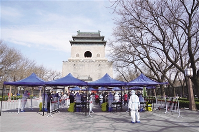 3月21日,在北京市東城區(qū)安定門(mén)街道鐘鼓樓文化廣場(chǎng)核酸采樣點(diǎn),醫(yī)護(hù)人員為居民進(jìn)行核酸采樣。 新華社記者 鞠煥宗 攝
