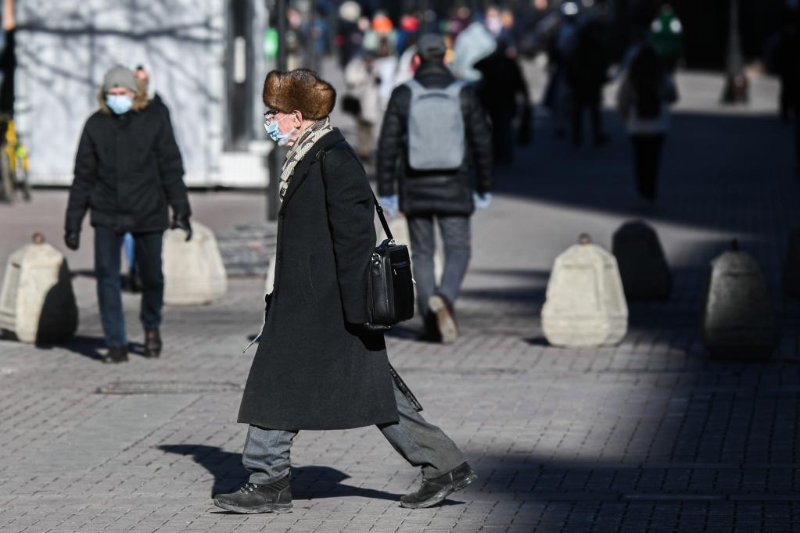 3月15日,人們佩戴口罩在俄羅斯首都莫斯科出行。(新華社發(fā),葉甫蓋尼·西尼岑攝)
