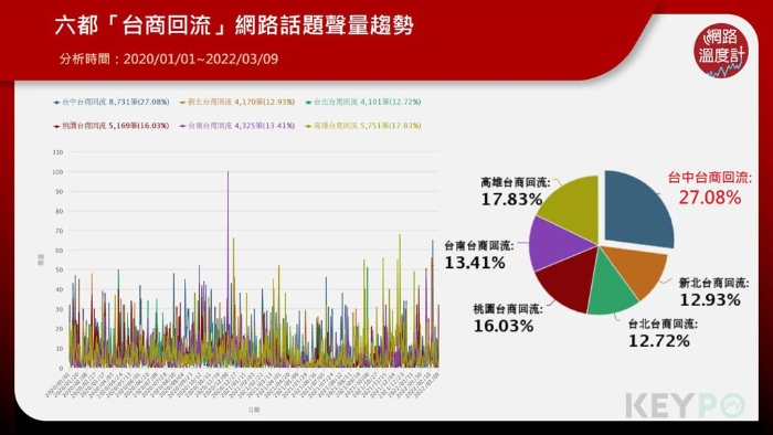 受到國際情勢不穩(wěn)定與疫情改變市場供應(yīng)鏈生態(tài)的影響,近幾年有越來越多臺商回流,臺灣當(dāng)局也大力鼓勵臺商回臺扎根,自2019年7月,推動“投資臺灣三大方案”加速這一波臺商回流熱潮。其中,臺中市率先“六都”最早成立“臺商專區(qū)”,建立單一窗口提供投資人各項(xiàng)服務(wù),不僅創(chuàng)下“六都”中投資臺灣三大方案的件數(shù)第一名,透過《KEYPO大數(shù)據(jù)關(guān)鍵引擎》調(diào)查(2020/01/01~2022/03/09),“六都”投資話題聲量熱度也由臺中奪冠,網(wǎng)絡(luò)聲量共計8,731筆。