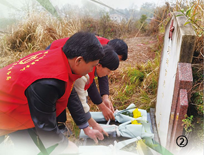 圖②:江西省吉安縣退役軍人志愿者向烈士墓碑敬獻(xiàn)鮮花。