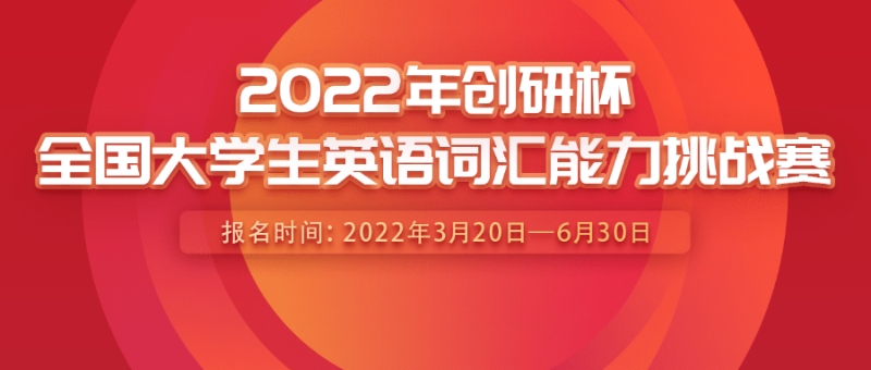 為深入貫徹落實(shí)教育部《關(guān)于加快建設(shè)高水平本科教育全面提高人才培養(yǎng)能力的意見》等文件精神,助推高校英語(yǔ)教學(xué)技法革新,激發(fā)大學(xué)生學(xué)習(xí)英語(yǔ)的熱情,增加英語(yǔ)詞匯的儲(chǔ)備量,特舉辦2022年創(chuàng)研杯全國(guó)大學(xué)生英語(yǔ)詞匯能力挑戰(zhàn)賽。