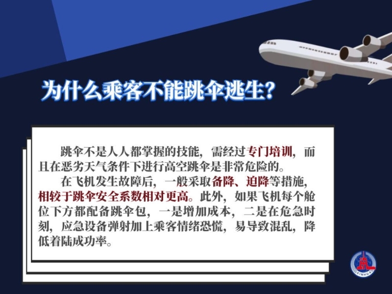 飛機發(fā)生事故時,乘客采取跳傘的方式自救可行嗎?專家表示,跳傘并不是人人都掌握的技能,需經(jīng)過專業(yè)培訓(xùn),而且在惡劣天氣下進行高空跳傘本身是非常危險的行為。在飛機發(fā)生故障后,一般采取備降、迫降等措施,這比跳傘的安全系數(shù)更高。如果座位下方都安裝跳傘包,一是增加成本,二是在危急時刻,應(yīng)急設(shè)備彈射加上乘客情緒恐慌,易導(dǎo)致混亂,降低著陸成功率。