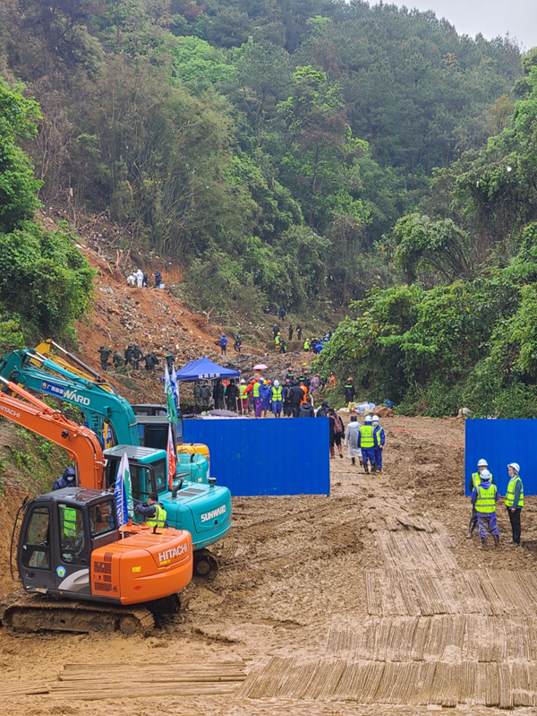 記者在現(xiàn)場(chǎng)看到,持續(xù)降雨導(dǎo)致路面泥土松軟黏稠,一些地方出現(xiàn)積水,人員行走不便,救援人員送來竹架板鋪在地上,以增大鞋面與地面的摩擦,防止打滑,便于救援工作順利開展。在事故現(xiàn)場(chǎng)核心區(qū)域,挖掘機(jī)等設(shè)備已準(zhǔn)備就緒。