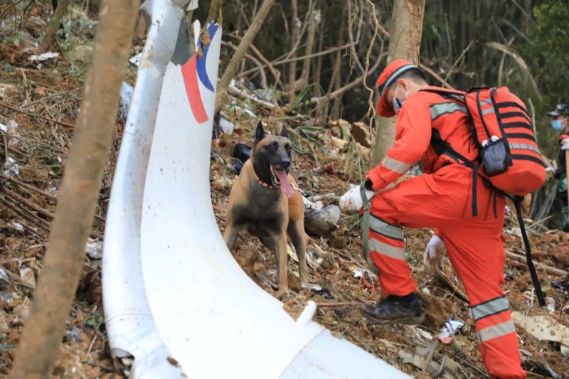 3月22日,在廣西梧州藤縣東航MU5735航班墜機(jī)事故現(xiàn)場(chǎng)核心區(qū),武警廣西總隊(duì)官兵利用警犬協(xié)助搜索。新華社發(fā)(江懷鵬 攝)