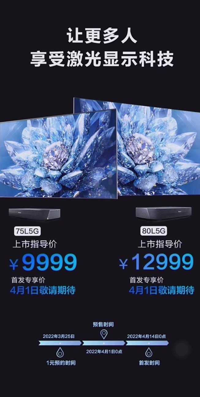 據(jù)介紹,全新海信激光電視L5G,75英寸上市指導(dǎo)價(jià)9999元;80英寸上市指導(dǎo)價(jià)12999元。3月25日起,海信京東自營旗艦店已開啟1元盲約。而在4月1日,海信還將公布首發(fā)專享價(jià),釋放更大福利。