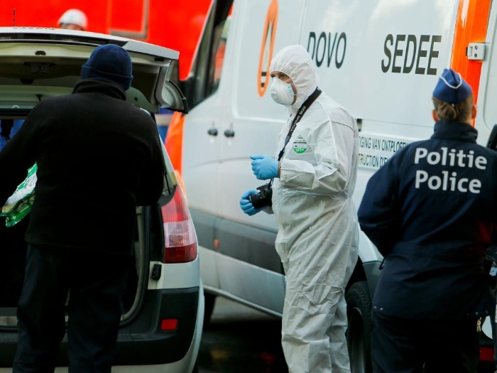 2015年11月26日,醫(yī)護(hù)人員在比利時首都布魯塞爾的大清真寺外工作。布魯塞爾大清真寺內(nèi)26日發(fā)現(xiàn)裝有白色粉末的可疑包裹。警方疏散了大清真寺內(nèi)的人員,工作人員攜帶檢測炭疽桿菌的設(shè)備到場調(diào)查。(新華社記者周磊攝)