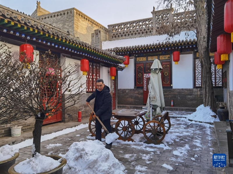 平遙居民范東山在自家的四合院里清理積雪(1月25日攝)。新華社記者 王學(xué)濤 攝