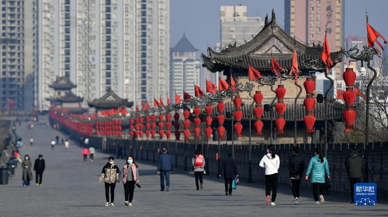 游客在西安城墻游覽(2020年3月4日攝)。新華社記者 劉瀟 攝