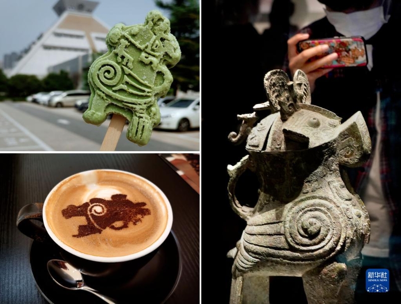 拼版照片:右圖為2020年9月24日,參觀者在河南博物院主展館內(nèi)拍攝展品“婦好鸮尊”(新華社記者李安攝);左上圖為2020年9月24日拍攝的河南博物院推出的“婦好鸮尊”冰淇淋(新華社記者李安攝);左下圖為2020年9月24日拍攝的河南博物院推出的“婦好鸮尊”圖樣咖啡(新華社記者李文哲攝)。新華社發(fā)
