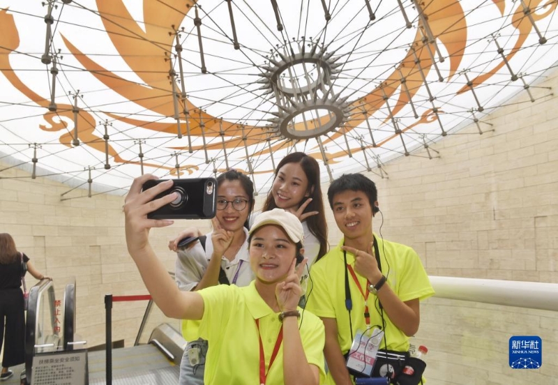 參加交流活動(dòng)的香港青年(后排)在四川金沙遺址博物館陳列館有“太陽神鳥”圖案的房頂前與志愿者(前排)合影留念(2019年8月25日攝)。新華社記者劉坤攝