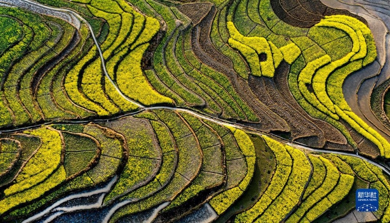 這是陜西省漢陰縣漩渦鎮(zhèn)鳳堰古梯田里的油菜花(2020年3月18日攝,無人機(jī)照片)。新華社記者陶明攝