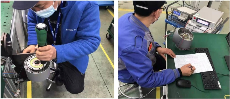 上海疫情封控管理的第一天,中科新松的臨港產(chǎn)業(yè)基地的生產(chǎn)車間內(nèi)一切井然有序,一臺(tái)臺(tái)多可協(xié)作機(jī)器人正在進(jìn)行出廠前的安裝、測(cè)試。生產(chǎn)人員佩戴口罩,認(rèn)真地對(duì)即將發(fā)貨的設(shè)備進(jìn)行專業(yè)檢測(cè)和記錄。