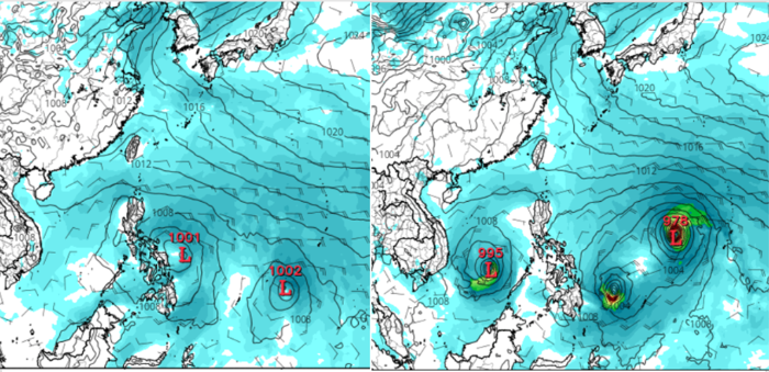 最新歐洲ECMWF(左圖)及美國GFS(右圖)模式,模擬10日20時(shí)地面圖顯示,南海至菲律賓東方海域各有熱帶擾動活動,但模擬的數(shù)量、位置、強(qiáng)度皆有差異。(圖擷自Tropical tidbits)
