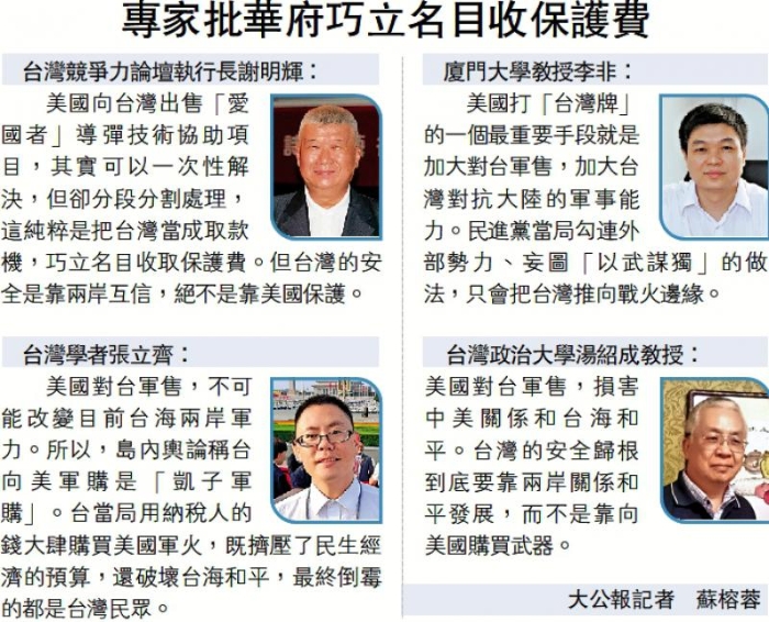 美國(guó)對(duì)臺(tái)軍售,不可能改變目前臺(tái)海兩岸軍力。所以,島內(nèi)輿論稱臺(tái)向美軍購(gòu)是“凱子軍購(gòu)”。臺(tái)當(dāng)局用納稅人的錢大肆購(gòu)買美國(guó)軍火,既擠壓了民生經(jīng)濟(jì)的預(yù)算,還破壞臺(tái)海和平,最終倒霉的都是臺(tái)灣民眾。