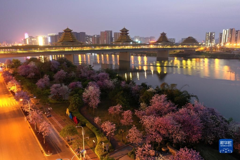在柳州市沿江路,夜幕下盛開的洋紫荊與城市景觀相映,格外美麗(無人機(jī)照片,4月10日攝)。