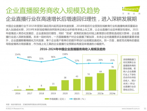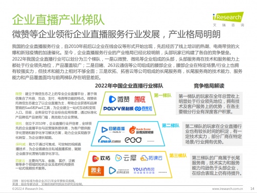 根據(jù)資料顯示,黑天鵝節(jié)點后,中國數(shù)字化進程加速,相關政策鼓勵企業(yè)數(shù)字化轉(zhuǎn)型,數(shù)字化轉(zhuǎn)型服務商明顯增長,技術發(fā)展與市場需求雙重驅(qū)動,主推企業(yè)直播服務擴容。同時,企業(yè)客戶不僅直播頻率逐步提升,其對于直播產(chǎn)品的要求也不斷提升,企業(yè)直播場景覆蓋廣泛,直播邊界進一步拓展,產(chǎn)品、服務技術能力進階提升,企業(yè)直播市場進入穩(wěn)中求勝的深耕發(fā)展期。