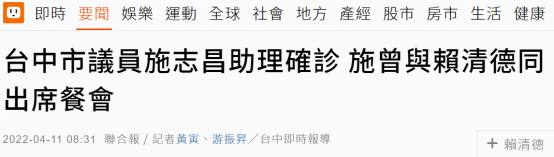 無獨有偶,臺灣地區(qū)副領(lǐng)導(dǎo)人賴清德也被卷入“貼貼不算密接”鬧劇。臺行政機構(gòu)司機與臺中市議員施志昌的助理相繼新冠確診,而賴清德曾于4月9日與施志昌出席相同餐會。蔡辦發(fā)言人張惇涵表示,賴清德今日一早也進(jìn)行快篩,結(jié)果為陰性,公務(wù)正常進(jìn)行。