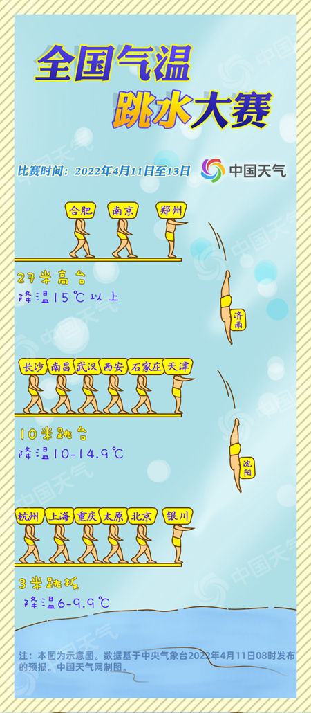 西安、沈陽、天津、石家莊進(jìn)入十米跳臺組,氣溫“跳水”實力也不容小覷,降溫幅度都將超過10℃。三米跳板組的實力稍弱一些,北京、太原、銀川的降溫幅度在6-9℃。