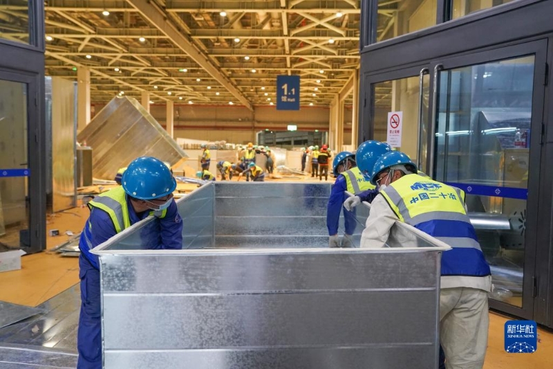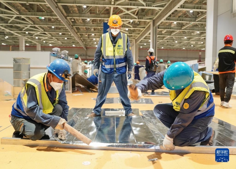 4月11日,工人在國家會展中心(上海)方艙醫(yī)院作業(yè)。新華社記者 丁汀 攝