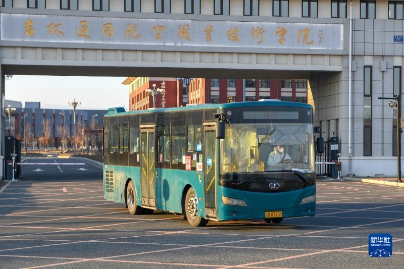 4月12日,轉(zhuǎn)運(yùn)患者的大巴車從吉林市第五方艙醫(yī)院駛出。