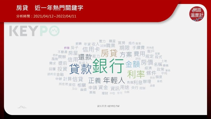 從《KEYPO大數(shù)據(jù)關鍵引擎》調查(2021/04/12~2022/04/11)來看“房貸”的熱門關鍵字,可以發(fā)現(xiàn),引起網(wǎng)友熱烈討論的在于“銀行”以及相關的“貸款”、“利率”、“還款”、“金額”等,可見在房屋貸款方面,民眾會特別在意銀行利率與還款金額等相關資訊。