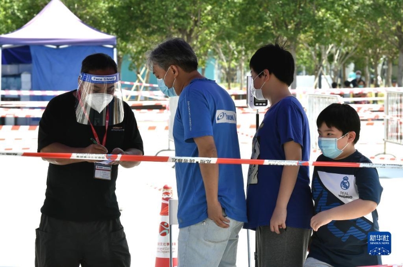 4月14日,在香港啟德流動采樣站,市民佩戴口罩排隊做核酸檢測。新華社記者 盧炳輝 攝