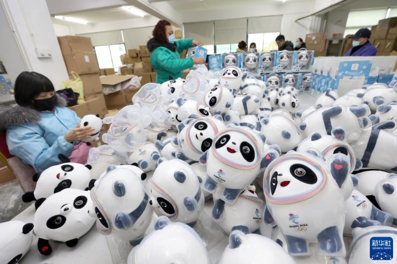 2月8日,工人在位于江蘇省啟東市的一家特許生產(chǎn)商的車間里包裝“冰墩墩”。新華社發(fā)(許叢軍 攝)