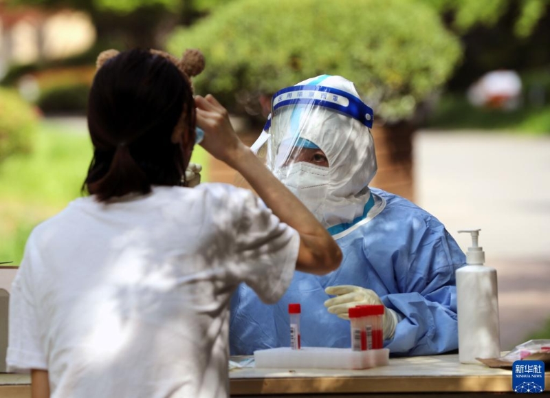 4月12日,在上海松江區(qū)一居民小區(qū)內(nèi),醫(yī)務(wù)人員進(jìn)行核酸檢測采樣。新華社記者 劉穎 攝