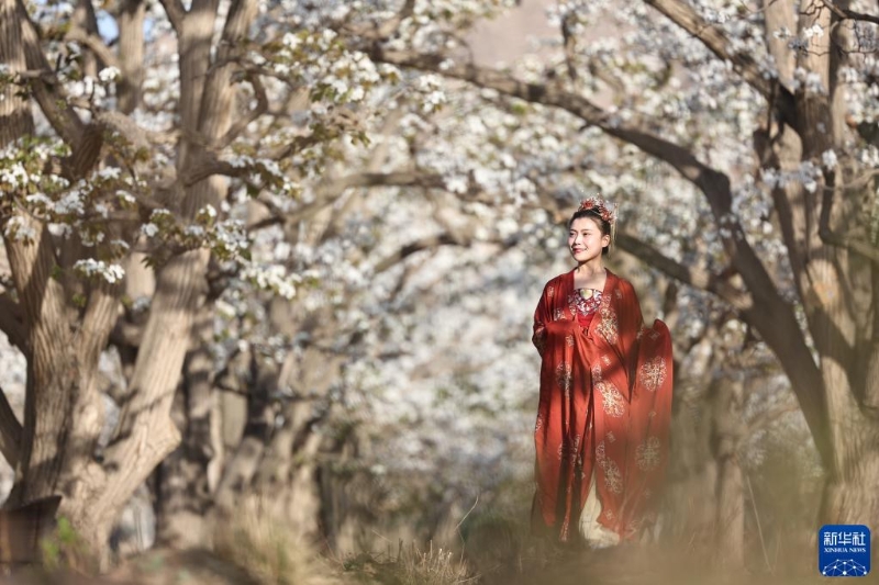 4月7日,景區(qū)工作人員在甘肅省蘭州市皋蘭縣什川鎮(zhèn)百年梨園內(nèi)進(jìn)行表演。受疫情影響,景區(qū)組織工作人員在梨園內(nèi)直播,邀請人們“云賞花”,滿足公眾賞花需求。新華社記者