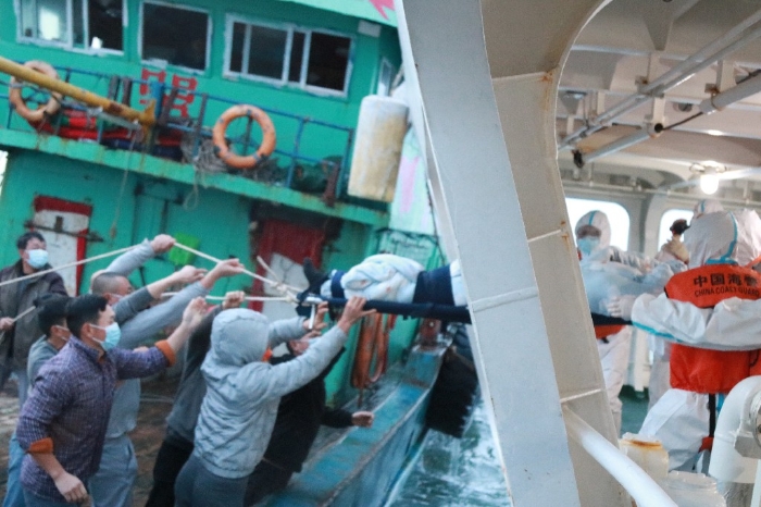 秀山艦經(jīng)一小時(shí)高速航行,抵達(dá)求助漁船所在海域。與求助漁船溝通后,秀山艦決定采取“小船靠大船”和“索橋轉(zhuǎn)運(yùn)”的方法進(jìn)行過(guò)駁。幾經(jīng)努力,海警執(zhí)法員和漁船漁民齊心協(xié)力將受傷漁民過(guò)駁至海警秀山艦。